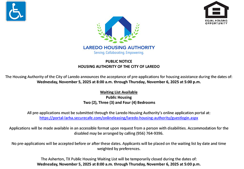 In accordance with the Texas Public Information Act, Texas Government Code Annotated Section 552.001 et seq., a person or party may request inspection of and/or duplication of the public records maintained by or for the Laredo Housing Authority.